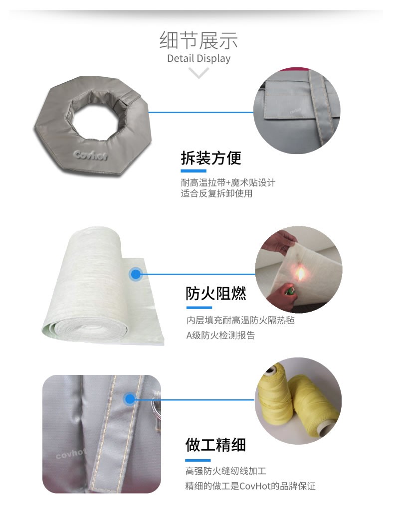 柔性可拆卸式1946伟德手机 隔热罩采用耐高低温防火保温材料;由内衬、中间保温隔热层、外保护层三层组成,能快捷的安装或拆卸,可以贴合不规则形状的设备、管道,且保温效果好、拆卸使用方便。