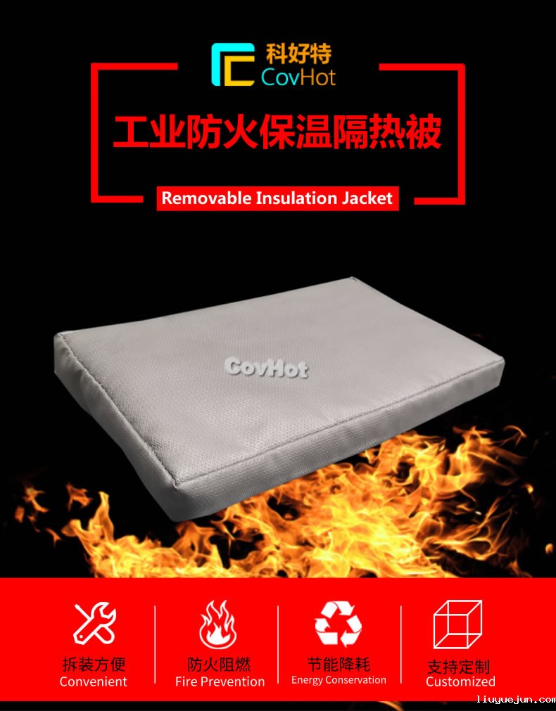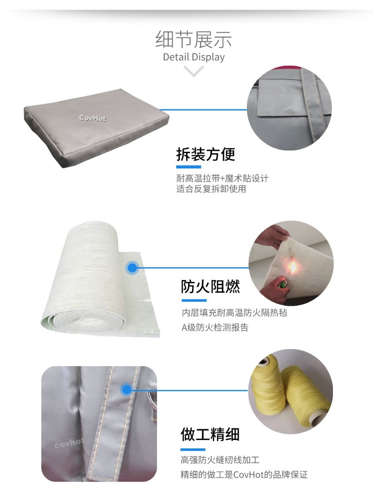 可拆式保温套保温效果好,拆装方便,易于日常维护保养,能反复使用,对环境无污染,与人体接触后不刺激皮肤。根据现场的物料产生火灾的可能性、火灾的预期温度、救火需要的时间等综合考虑,设计适应不同的温度、耐火时间,从而达到经济、合适的防火效果。