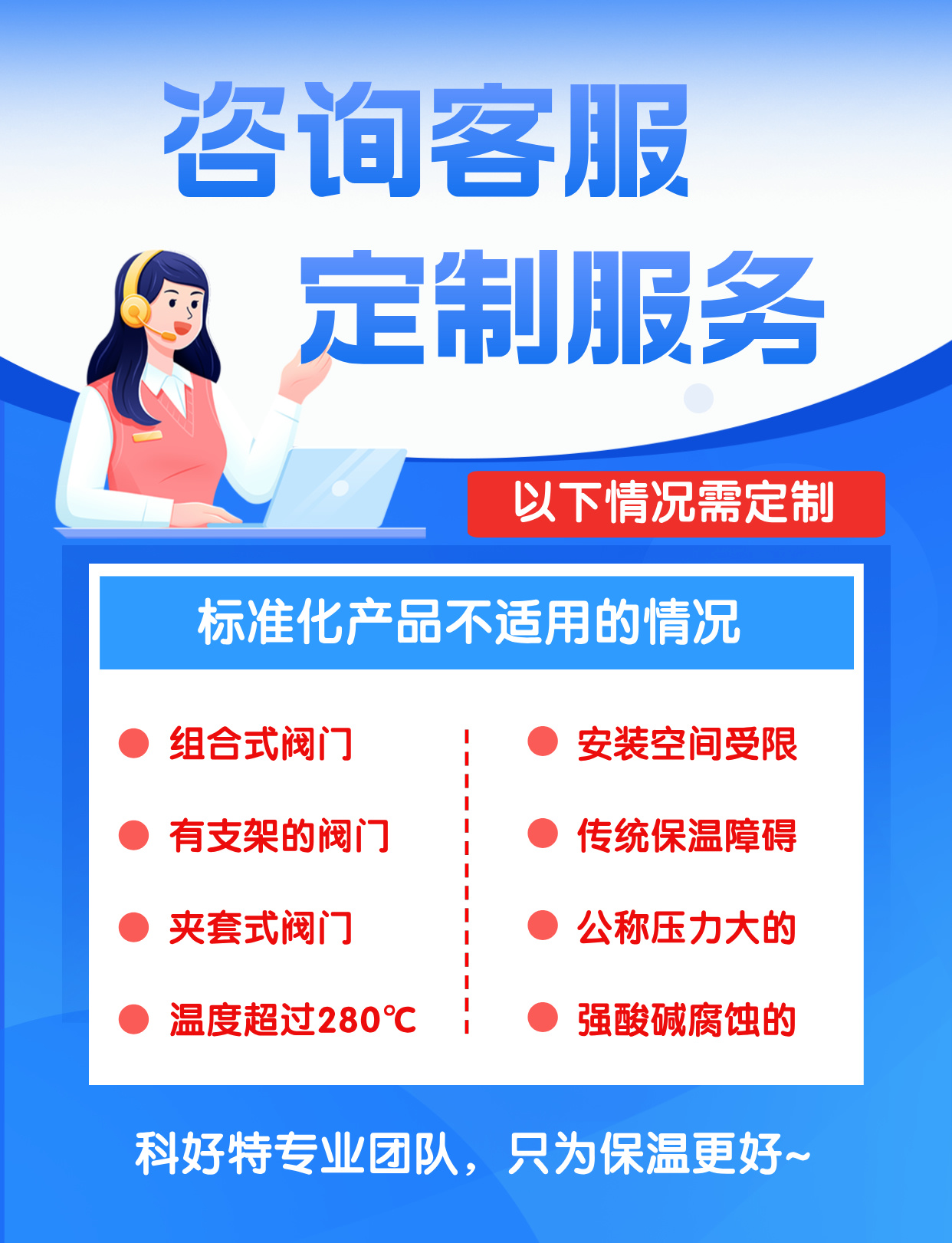 可拆卸截止阀保温套可以满足不同领域的柔性保温应用需求。可以很方便进行拆装操作,可重复多次使用,以最大化其经济效益,降低热损耗。对于一些表面形状特殊、复杂的设备隔热(防火),柔性隔热防火)套也能显示其独特的优势。经测试计算,采用本产品后,通常可节约热能达90%以上。有些用户短投资回收期仅为6个月左右。