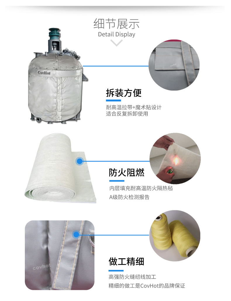 工业罐体保温套无需专业保温人员,无需专业培训,操作简单快速,表层纤维布不含石棉成分,防油、防水性能优良,无纤维飞散问题,环保、安全、卫生。隔热保温效果佳,耐温可达1170度。具有易操作,节省维护时间和保温成本。光泽、平整、美观、使用寿命长、防雨、防酸碱、抗老化,柔软,拆卸方便,重复使用,节能环保。解决了经常拆卸部位难以重新保温的问题,减少了能源浪费。